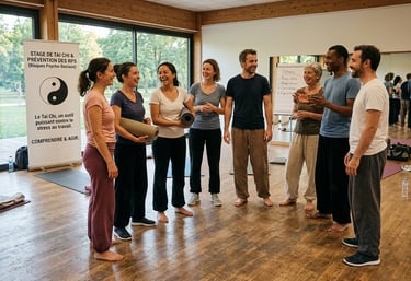 L'image ci-dessus capture parfaitement l'atmosphère de joie, de détente et de connexion qui règne à la fin de nos stages. Un groupe de collègues, souriants et détendus, échange de manière informelle, témoignant de l'impact positif de la pratique du Tai Chi sur leur moral et leur bien-être général. Les visages épanouis et les postures relâchées témoignent de la réduction du stress et de l'amélioration du climat de travail.